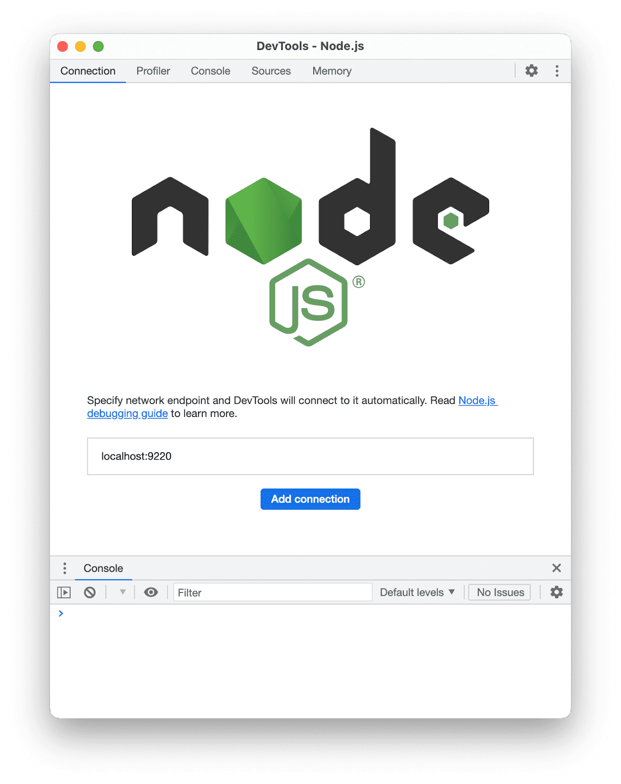 If localhost:9229 doesn't appear automatically, add it manually: