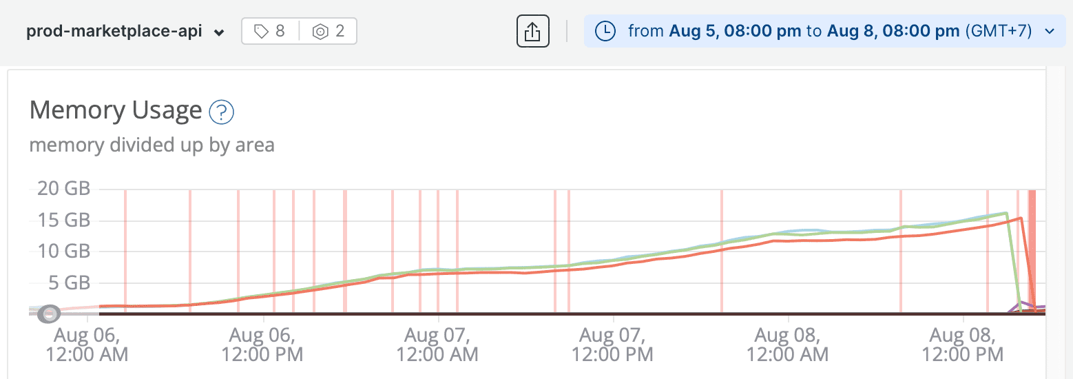 On NewRelic, we could visualise the heap size over time. The chart told the whole story — memory was climbing continuously from a few GB all the way to 15–20 GB before the container crashed: