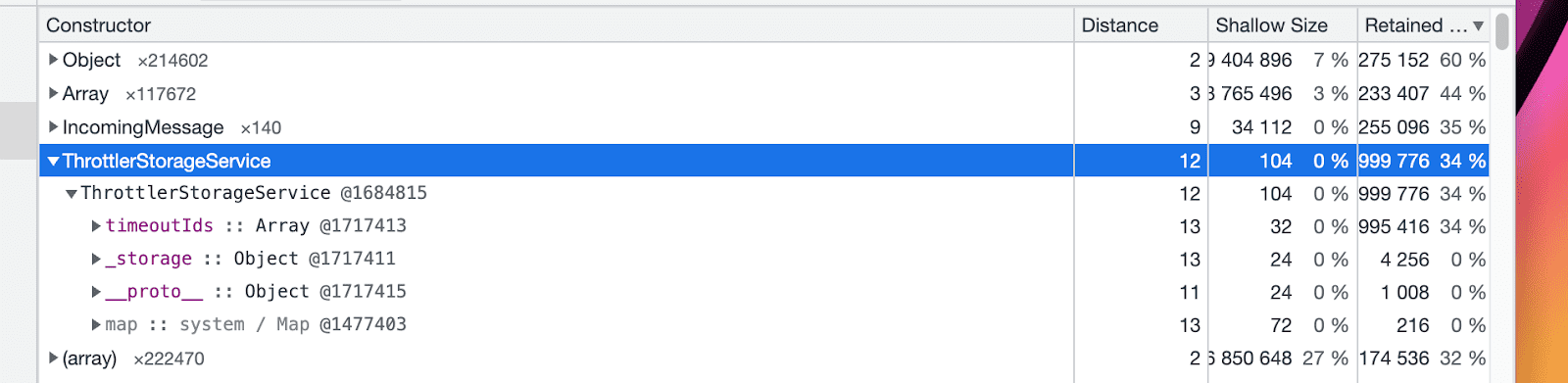 In the snapshot, sorted by retained size, ThrottlerStorageService immediately stood out — it was consuming 34% of the entire heap in QA (almost certainly higher in production):