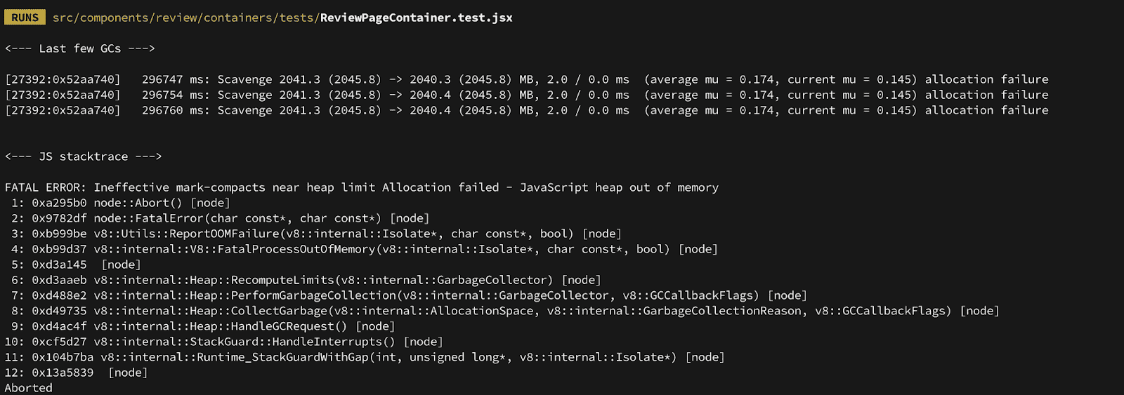 We investigated the container logs and found the culprit — a hard crash with a JavaScript heap out of memory error: