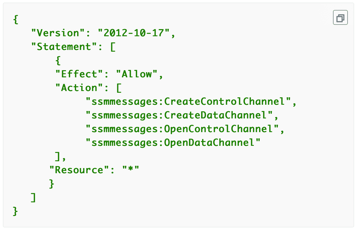 Add the required IAM permissions to the ECS task role so AWS Session Manager can exec into the container: