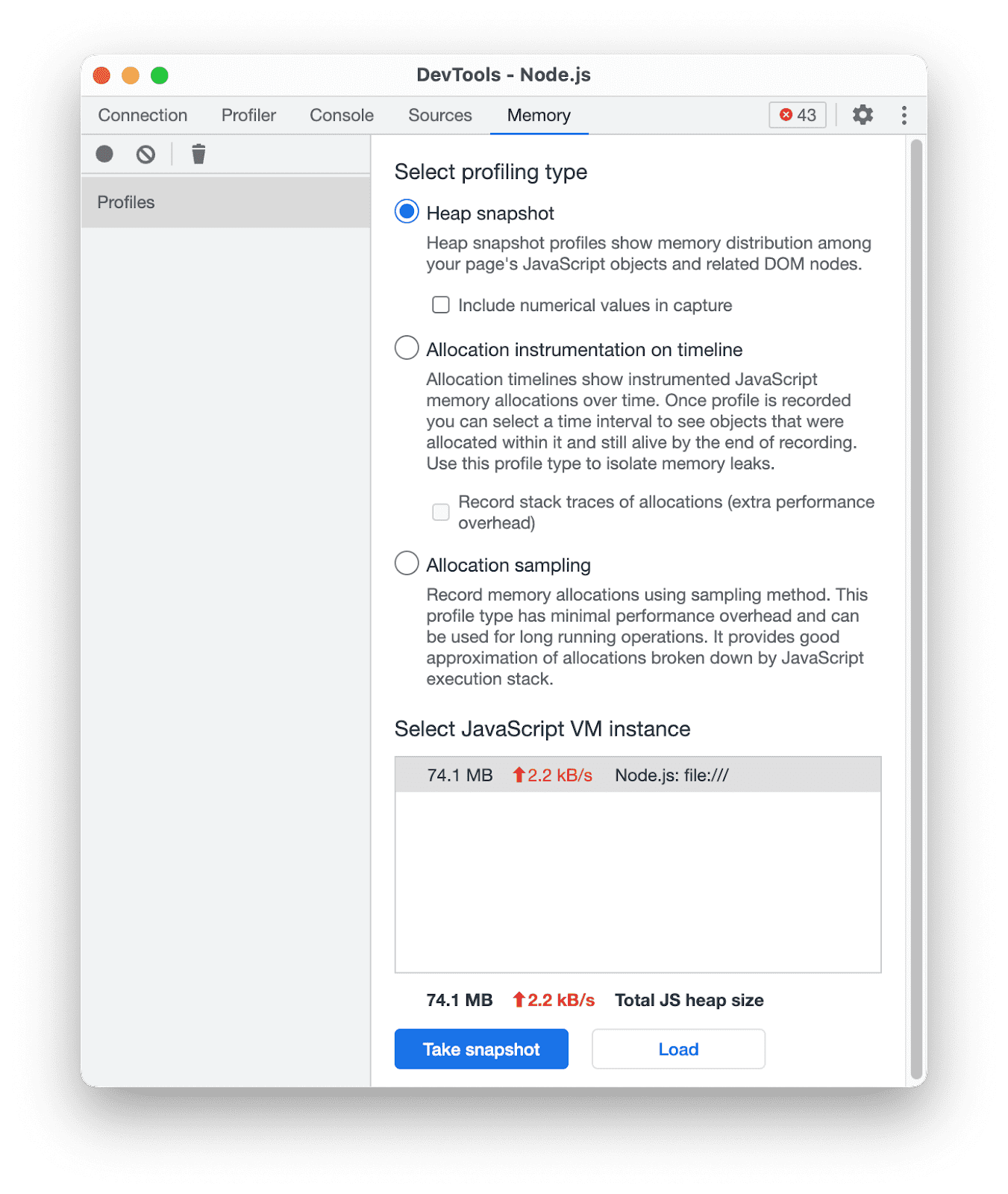 Once connected, navigate to the Memory tab, select Heap Snapshot, and click Take Snapshot: