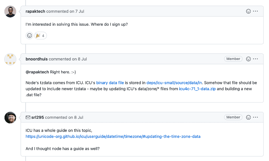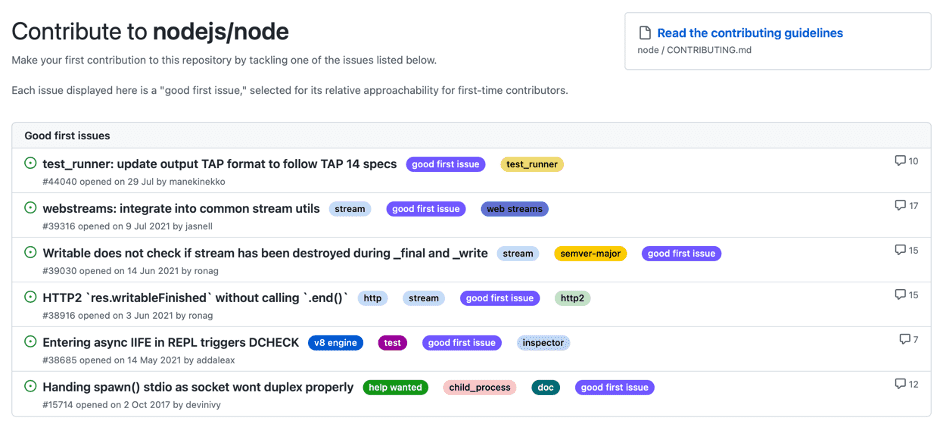 It wasn’t easy as the code base was huge, and it was challenging to find issues for me to pick. The contribute page on the GitHub repository is the best place to find topics. For Nodejs, it was https://github.com/nodejs/node/contribute. You need to find issues with the label “good first issue.” Make sure you read the contributing guidelines first.
